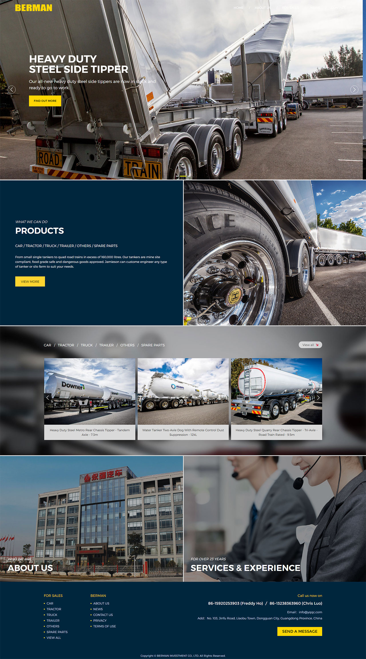 服務(wù)內(nèi)容:外貿(mào)網(wǎng)站建設(shè)、英文網(wǎng)站建設(shè) Berman Investment Co., Ltd. was established in Hong Kong on February 29, 2012. We provide diversified products and services to meet the different needs of customers. And our business cover the distribution, export, supporting testing, spare parts supply,